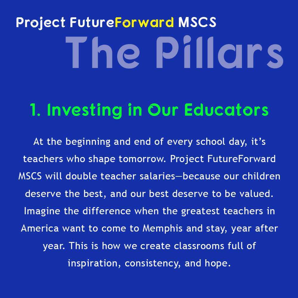 At the beginning and end of every school day, it’s teachers who shape tomorrow. Project FutureForward MSCS will double teacher salaries—because our children deserve the best, and our best deserve to be valued. Imagine the difference when the greatest teachers in America want to come to Memphis and stay, year after year. This is how we create classrooms full of inspiration, consistency, and hope.