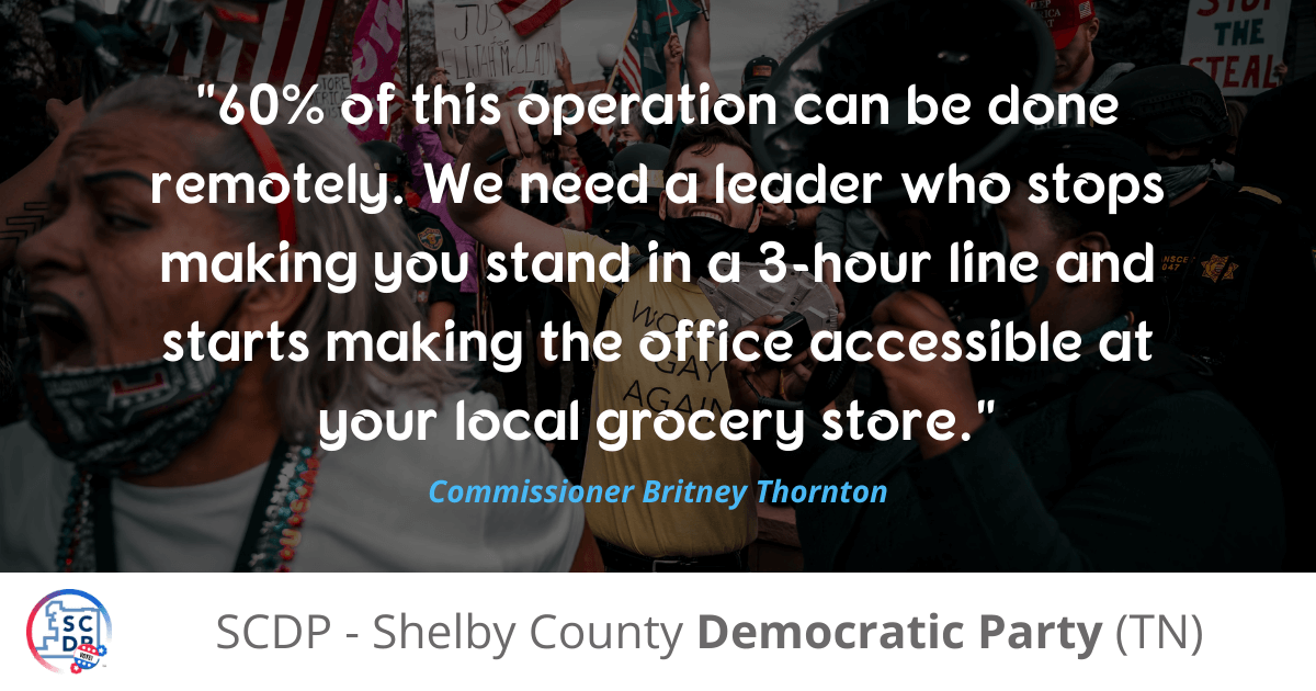 "60% of this operation can be done remotely. We need a leader who stops making you stand in a 3-hour line and starts making the office accessible at your local grocery store." — Commissioner Britney Thornton